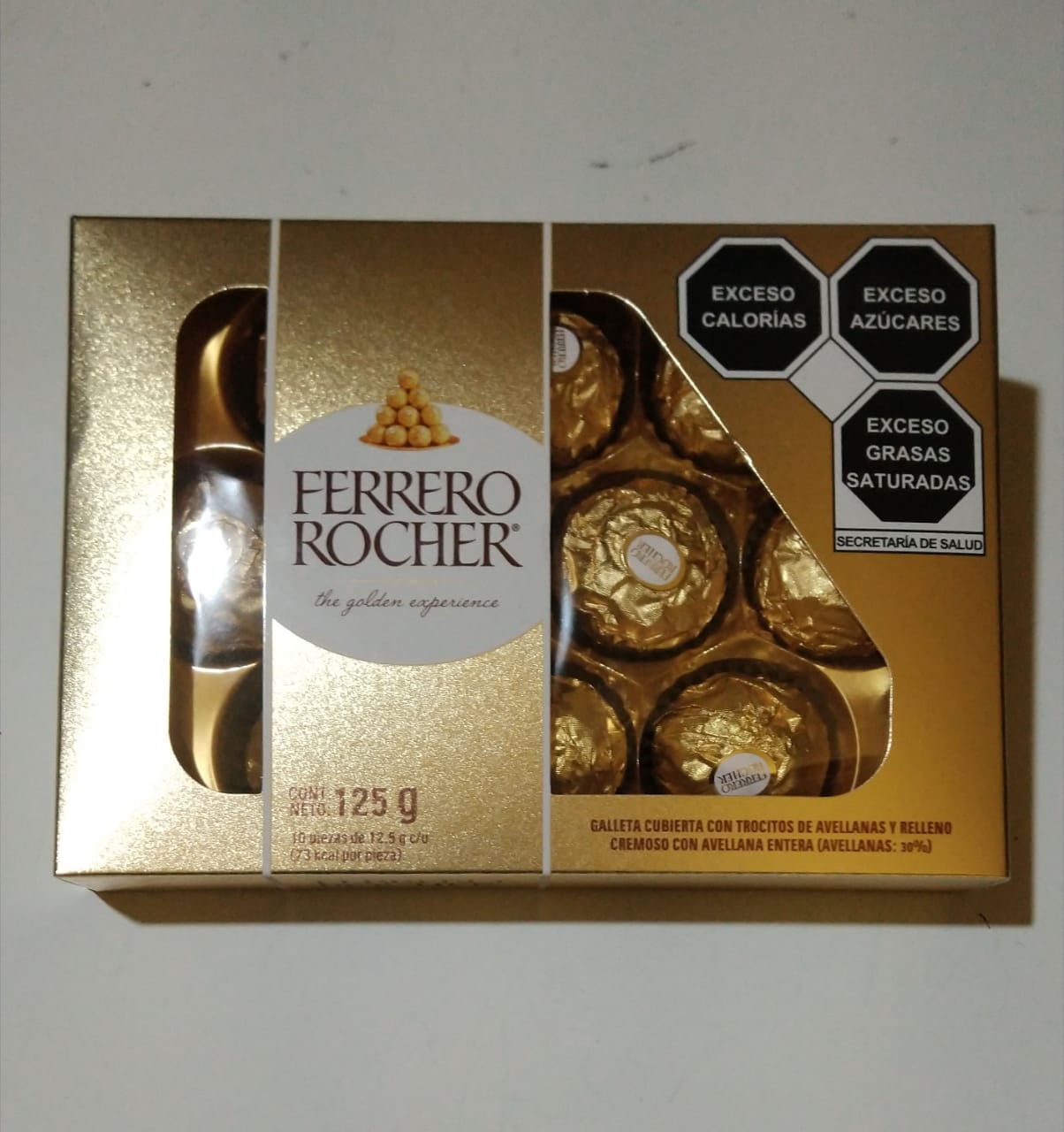 Delicioso chocolate Ferrero Rocher, la galleta cubierta con trocitos de avellana y relleno cremoso con avellana entera.